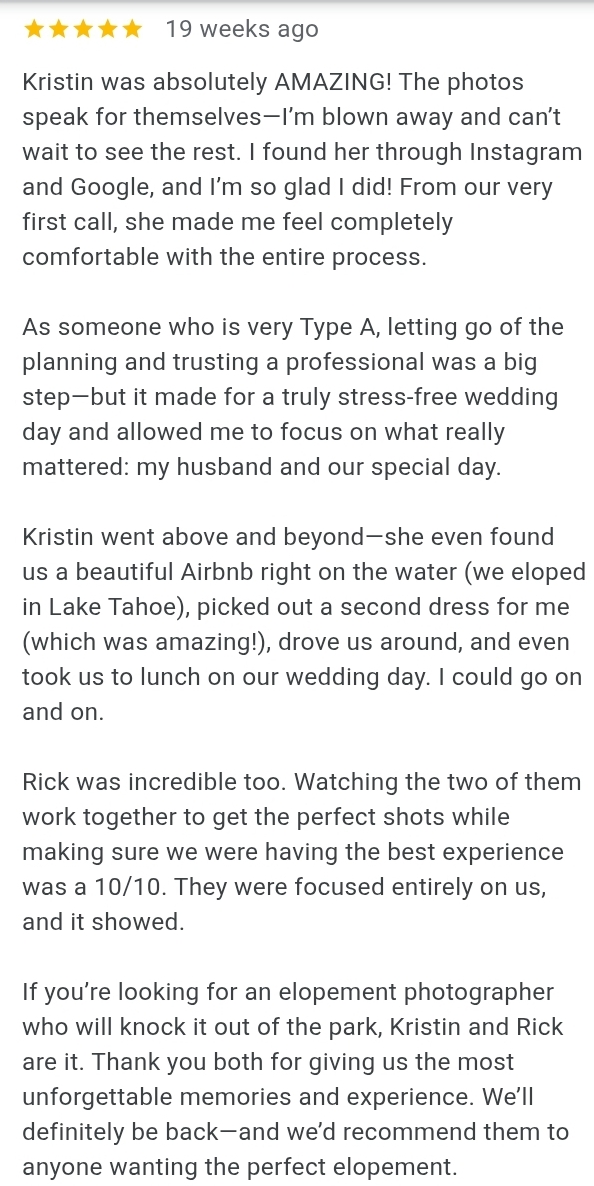 One of the best ways to understand what it’s like to work with a photographer is by reading reviews from past couples.