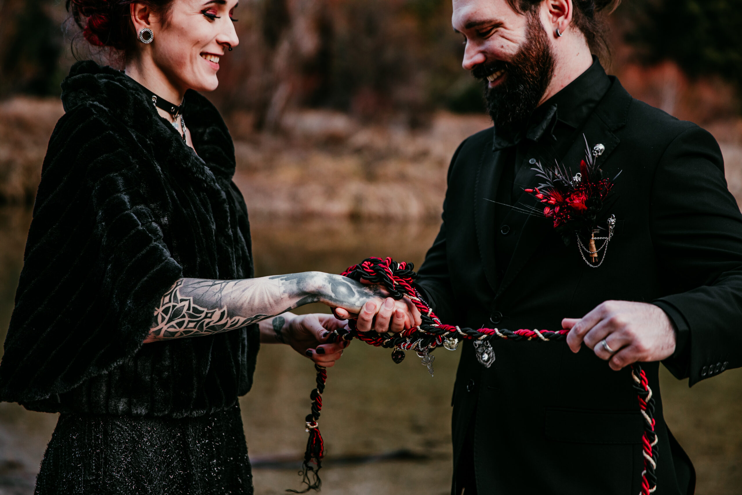 A handfasting ceremony is a symbolic ritual where a couple’s hands are tied together using a cord or ribbon to represent unity and commitment. It’s where the phrase “tying the knot” comes from and is often included in modern elopements as a meaningful, non-traditional element.
